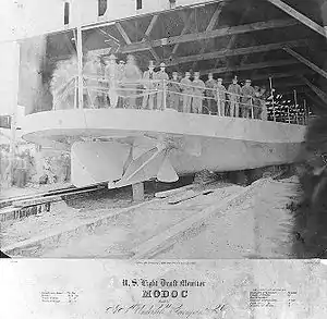 USS Modoc, a single turret, an 1,175-ton Casco-class light draft monitor built under contract by J. S. Underhill at Greenpoint, Brooklyn, was completed as a spar torpedo vessel in June 1865. She had no active service, spending her entire Navy career laid up "in ordinary" at Philadelphia. The vessel was renamed Achilles on 15 June 1869, but returned to Modoc on 10 August. The ship was broken up at New York in August 1875.