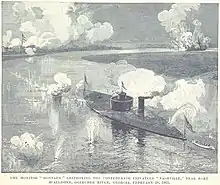 A principal ironclad in the naval attack on Charleston, South Carolina, Montauk departed New York on December 24, 1862, arriving Port Royal, South Carolina on January 19, 1863, to join the South Atlantic Blockading Squadron. Taking advantage of the opportunity to test the XV-inch Dahlgren gun and armor of the Passaic-class ironclad for the first time, on January 27, Rear Admiral Samuel F. Du Pont sent Montauk, with the gunboats USS Seneca, USS Wissahickon, USS Dawn and mortar schooner USS C. P. Williams to bombard Fort McAllister, Georgia. Although hit 13 times, Montauk was undamaged. The ironclad made a second attack on February 1, badly battering the fort; but Montauk was hit 48 times. She destroyed the blockade runner Rattlesnake on February 28 in Ogeechee River but while descending the river was herself damaged by a torpedo (mine) which exploded under her.