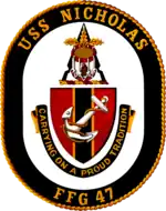 USS Nicholas (FFG-47), an Oliver Hazard Perry-class frigate, was the third ship of the United States Navy to be named for Major Samuel Nicholas, the first commanding officer of the United States Marines. A third-generation guided missile frigate of the Oliver Hazard Perry class, she was laid down as Bath Iron Works hull number 388 on 27 September 1982 and launched 23 April 1983. Sponsor at her commissioning there on 10 March 1984 was the same Mrs. Edward B. Tryon who sponsored DD 449 in 1942.