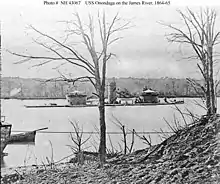 Escorted by the gunboat USS Mattabesett, the ship departed New York City on 21 April and arrived at Hampton Roads in Union-occupied Virginia two days later. Assigned to the James River Flotilla, she supported General Ulysses S. Grant's drive on Richmond, Virginia.[9] Together with the other ships of the flotilla, Onondaga patrolled the river and occasionally engaged Confederate artillery batteries on the river.[1]