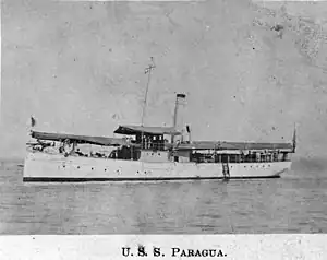 Paragua was laid down for the Spanish Navy by the Manila Ship Company, Cavite, Philippine Islands, in March 1887 and launched in January 1888. She was named for the island of Palawan, known as Paragua prior to 1905. When the Spanish–American War broke out in April 1898, Paragua was part of the Spanish Pacific Fleet based at Manila, Philippines[1][2] Paragua was one of ten gunboats put up for sale in early 1899 by the Spanish navy at its former base on the southern island of Basilan following the signing of the Treaty of Paris that ended the Spanish–American War. The gunboats were purchased by a syndicate of private individuals put together by General Elwell Otis, the U.S. Army commander, in order to prevent their being acquired by the Philippine Revolutionary government. The Army bought the ships from the syndicate and then sold them to the U.S. Navy in early May 1899. Paragua was commissioned on 29 May 1899, Ensign W.C. Davidson, commanding.