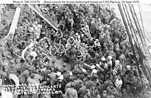 A brass band playing to a crowd of troops aboard Patricia, 26 June 1919
