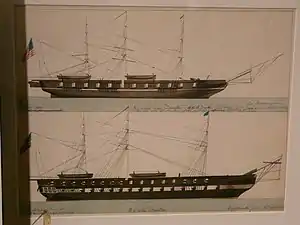 Princeton was employed with the Home Squadron from 1845 to 1847. She later served in the Mediterranean from August 17, 1847, to June 24, 1849. Upon her return from Europe, she was surveyed and found to require $68,000 ($2.21 million in present-day terms) to replace decaying timber and make other repairs. The price was deemed unacceptable, and a second survey was ordered.[31] She was broken up at the Boston Navy Yard that October and November.[32][33]