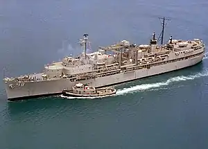 The exchange was completed by mid-January, 1973, and Proteus resumed her duties. In 1974 personnel from the Ship Repair Facility at Naval Base Guam removed the remaining 5-inch gun turret and munitions as unnecessary for her primary mission – leaving only the four 20mm mounts as her main defensive weapons. When Saigon fell in 1975, some 100,000 Vietnamese fled their country and were processed by the U.S. on Guam. In a massive undertaking called Operation New Life,[3] every able-bodied individual who could be spared helped provide facilities to care for the refugees. As part of that effort over 1,000 officers and men from Proteus worked with Seabee construction personnel to erect the refugee tent city at Orote Field on Naval Base Guam, leaving only a hand-picked skeleton crew of individuals aboard to see to her safety and security; as well as handle emergencies from the boats that were in. But for that week, Proteus was out of business as usual – for which the Secretary of the Navy awarded Proteus her second Meritorious Unit Commendation in 1975; and she (along with other participating Navy Units) were awarded the first award of the Navy Humanitarian Service Medal (established by Executive Order January 1977 for actions beginning 1 April 1975).