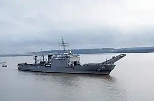 Saginaw was renamed HMAS Kanimbla (L 51) in Australian service and commissioned into the Royal Australian Navy on 29 August at Norfolk, Virginia. Kanimbla underwent conversion in May 1995 at Forgacs Shipbuilding, Newcastle, New South Wales. The LST was significantly modified by removing its bow ramps and adding another deck over the bow of the ship, allowing for a third landing spot and increased aviation fuel capacity. Over the new deck two LCM-8 landing craft were carried when the third landing spot was not in use, and were handled by a 70-ton crane. Improved medical facilities were also constructed. A hangar was installed aft, allowing for the stowage of four Seahawk helicopters.[16][17] Kanimbla was based at Sydney, Australia.[17] Kanimbla was taken out of service in November 2011 and replaced by HMAS Choules and the Canberra-class landing helicopter docks.[18] Kanimbla was towed back to the United States in October 2013 and arrived in New Orleans, Louisiana, for scrapping by Southern Scrap Recycling.