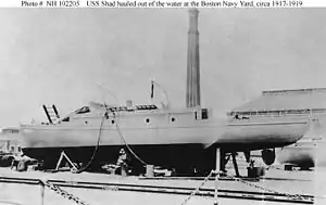 ![]() USS Shad (SP-551) hauled out of the water at the Boston Navy Yard in Boston, Massachusetts, sometime between 1917 and 1919. | |