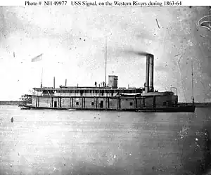 The first ship to be named Signal by the Navy—a wooden-hulled, stern-wheel steamer built in 1862 at Wheeling, Virginia (now West Virginia)—was purchased by the U.S. Navy on 22 September 1862 at Saint Louis, Missouri. Although no record of her commissioning has been found, it is known that she was in operation on 22 October 1862, when she departed Carondelet, Missouri and headed down the Mississippi River to join in the campaign against the Confederate river fortress at Vicksburg, Mississippi. Acting Volunteer Lieutenant John Scott was mentioned as her commanding officer in an order issued on 14 November and presumably commanded the ship from the start of her service. Signal's first weeks were devoted to duty as a dispatch vessel. On 29 November, she and Marmora entered the Yazoo River on a reconnaissance expedition and ascended that stream some 21 miles. From time to time, riflemen fired upon the ships from the river banks; but, in each instance, the ships shelled and dispersed the attackers. That afternoon, the ships returned to the Mississippi unharmed.