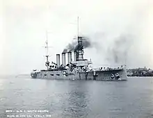 ![]() USS South Dakota (ACR-9), port bow view at anchor, location and date unknown. | |