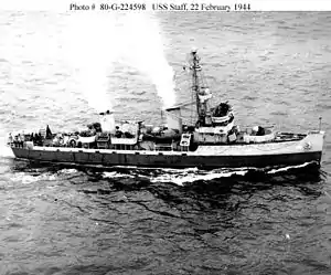 USS Staff (AM-114) was an Auk-class minesweeper acquired by the United States Navy for the dangerous task of removing mines from minefields laid in the water to prevent ships from passing.