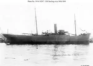 Pressed immediately into service during the Spanish–American War, Sterling was assigned to support the Flying Squadron from 1 through 24 May 1898. The Flying Squadron's commander, Commodore Winfield S. Schley, noted the Sterling lacked a hoisting engine, and deemed her insufficient for coaling his forces. She was then assigned to the North Atlantic Squadron where, on 27 May, Rear Admiral William T. Sampson sent her, under escort of the USS New Orleans to join the blockade of Santiago de Cuba. Should it have been necessary to prevent the Spanish fleet from leaving, Sterling was to have been sunk at the narrowest part (determined to be 300 feet wide) of the channel leading into the harbor. That requirement never materialized, and the Sterling performed her primary mission of coaling warships.[19]