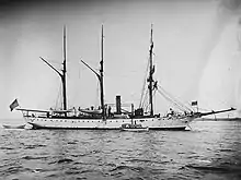 Almost a year later, on 15 May 1900, the gunboat was recommissioned at Newport, R.I.[25] After six months of operations in the Atlantic, Vicksburg stood out of Boston on 9 November for duty on the Asiatic Station.[26] She sailed via the Mediterranean Sea and the Suez Canal and arrived at Cavite—on the island of Luzon in the Philippines—on 2 February 1901.[27] During the first of her three years in the Far East, Vicksburg joined other Navy units in supporting the Army's campaign in the Philippine–American War which followed Spain's ceding the islands to the U.S.[28] Vicksburg herself contributed significantly to the success of those operations when she assisted Army forces in capturing the Philippine president, Emilio Aguinaldo, at Palanan, Isabela in March 1901.[28][29] She also cooperated with the Army again in June during the occupation of Puerto Princesa and Cuyo, the two major cities on the island.[27]