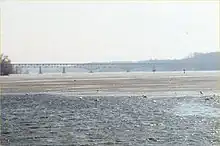 The first segment of an eastward extension of the Keeler Street Expressway, named the Irondequoit–Wayne County Expressway, opened c. 1971 between the Sea Breeze Expressway (at this point designated as part of NY 47) and Five Mile Line Road. In between, US 104 crossed Irondequoit Bay by way of the Irondequoit Bay Bridge.[44][47] US 104's former surface alignment between NY 47 and Five Mile Line Road was redesignated NY 404[44][48] while US 104 was temporarily realigned onto Five Mile Line Road between the expressway and Ridge Road to connect to its former alignment.[49]