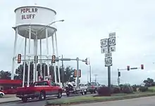 The eastern terminus of US 160 was originally located at an intersection with U.S. Route 60 and then-U.S. Route 66 in Springfield, Missouri (Grant Avenue and College Street). In the 1950s, the terminus moved eastward across the state to an intersection with then-US 60 and then-U.S. Route 67 (now US 60 Bus. and U.S. Route 67 Business) in Poplar Bluff. The extension between Springfield and Poplar Bluff was parallel to U.S. Route 65 from Springfield to Highlandville. Between Highlandville and Holister, the highways ran concurrently. Past Holister, US 160 headed east across the Ozark Mountains.[5] Route 160 was later routed further north in the Branson area, replacing a section of Route 148.[6] In 2007, the terminus was moved to its current location southwest of Poplar Bluff, eliminating a concurrency between US 160 and two other highways (US 67 and US 67 Business) over the last 10 miles (16 km) of US 160.