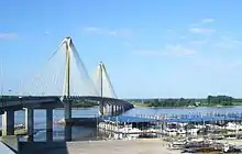 Design work on the new bridge began in 1985.[46] In November 1989, the federal government released $26.4 million of discretionary funds for the construction of a $92-million, four-lane replacement (equivalent to $51 million and $178 million, respectively, in 2021[7]).[47] By the end of 1991, the federal government had contributed $70 million to the project (equivalent to $126 million in 2021[7]).[48] Engineers from IDOT decided on a cable-stayed bridge to replace the old truss bridge; the first of its kind in Greater St. Louis.[49] Construction on the piers began in 1991 and progressed without incident.[46] The last piece of framing was installed on May 7, 1993. Crews anticipated that the bridge would open around December 1, 1993.[50] The Great Flood of 1993 did not damage the bridge and construction was only delayed for two months when the U.S. Army Corps of Engineers closed the river to barge traffic.[46] The new Clark Bridge opened on January 6, 1994.[51]