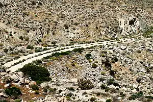 US 80 was designated on November 11, 1926, along with the rest of the U.S. Routes.[36] The asphalt road was constructed through the valley as the main east–west route, and was open by 1927.[27] Another road was constructed in the early 1930s, to remove curves and widen the lanes.[32] The result was a two-lane road that still had many switchbacks, with one popularly known as "Dead Man's Curve".[37] Planning for this new alignment was underway in 1932, and much of the work was to be located at the Viejas Grade, and at the segment just west of Alpine.[38] Paving continued on US 80 into 1934, just west of the sand dunes.[39]