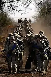 Infantry is a core part of the Army's Brigade Combat Teams. The most numerous variant, the Infantry Brigade Combat Team, comprise light infantry battalions who fight on foot. Infantry Brigade Combat Teams of the 82nd Airborne Division are air assault capable, with infantry soldiers being transported by U.S. Army Aviation UH-60 Black Hawk and CH-47 Chinook helicopters.[62] Infantry Brigade Combat Teams of the 11th Airborne Division, 82nd Airborne Division, and 173rd Airborne Brigade are capable of airborne operations, in cooperation with the U.S. Air Force's transport aircraft.[63] Finally, Infantry Brigade Combat Teams assigned to the 10th Mountain Division specialized in mountain warfare.[64] Standard Infantry Brigade Combat Teams are assigned to the 25th Infantry Division, which offers additional training in jungle warfare.[65]