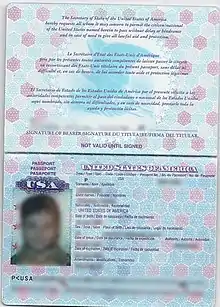 The United States Department of State has announced, and, in March 2021, started to issue, the next generation passport.[2] The passport will have an embedded data chip on the information page protected by a polycarbonate coating; this will help prevent the book from getting wet and bending, and—should a passport be stolen—the chip will keep thieves from stealing personal information and falsifying an identity. The passport number will also be laser cut as perforated holes that get progressively smaller through pages—just one of several components of the "Next Generation" passport, including artwork upgrade, new security features such as a watermark, "tactile features," and more "optically variable" inks.[35] Some designs on pages will be raised, and ink—depending on the viewing angle—will appear to be different colors.[36][37] On November 18th, 2022, the Department of State announced that they are now issuing all passport books as Next Generation Passports.[38]