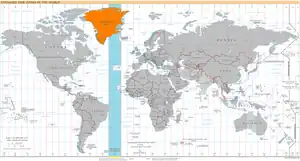 - The westernmost part of legal UTC−01:00 area in Ittoqqortoormiit Municipality (East Greenland)