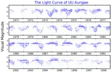 UU Aurigae is classified as a semiregular variable of type SRb, indicating it is a giant star with poorly defined variations. Its brightness varies from magnitude +4.9 to +7.0 in visual apparent magnitude.[2] The period is given in the GCVS as 441 days, but there is also a strong variation with a period of 235 days.[12] Using British Astronomical Association observations from 1971 to 1998, the periods are calculated as 439.4 and 233.1 days.[13]