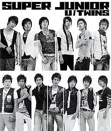 "U / Twins" is a Japanese CD single released by Super Junior to commemorate their first Japan fan-meeting at Nippon Budokan in Tokyo and to celebrate the grand opening of their official Japanese website on April 1, 2008.[8] It was released in Japan on July 9, 2008. The single peaked at #4 on Japan's Oricon Daily Chart on day of release, but dropped down four places in its second. The single was notable for being the first Korean single to be listed in the top 10 of Japan's Oricon Weekly Chart.[9]