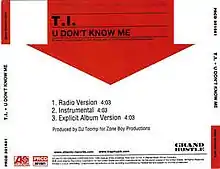 "U Don't Know Me" is a song by American hip hop recording artist T.I., released on January 11, 2005, as the second single from his third studio album, Urban Legend (2004). The single peaked at number 23 on the US Billboard Hot 100 chart.[1] The song appears in the video game Midnight Club 3: DUB Edition.