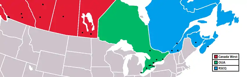 In the RSEQ conference, the five teams play against each opponent four times (twice home and twice away) for a total of 16 regular season games.[20] In the OUA, the 13 teams play against ten different opponents twice, for a total of 20 games.[23] The OUA previously had two divisions, but moved to singular conference play beginning with the 2022-23 season.[23] Canada West has a similar format to the OUA, where 13 teams play all opponents twice, for a total of 24 games.[21]