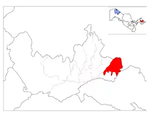 Uchqoʻrgʻon is a district of Namangan Region in Uzbekistan. The capital lies at the city Uchqoʻrgʻon.[1] Its area is 300 km2.[2] Its population is 174,600 (2021 est.).[3]
