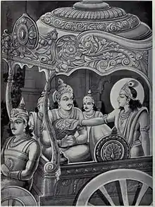 - Krishna leaves the city of Kauravas, with Karna in a chariot. He tells Karna who Karna's real mother is, how he is a brother of the Pandavas, asks he should join his brothers and they will cheerfully accept him and will choose him the next king. Karna already knowing this, refuses, saying obtaining him, Duryodhana provoked hostilities with Pandavas, and he cannot betray him since he was first to hold his hand for friendship and gave him kingdom, nor from affection he can leave Radha and Adiratha who cared him from childhood, for Kunti who abandoned him without thinking about his future and it will be englorious for him and his mother. He asked Krishna to conceal this for the present. Karna repents for his cruel acts in the past for pleasing Duryodhana. He said he knows he will die in the great war being on unrighteos side, but cannot leave his friend in distress, so will challenge Arjuna and will earn great merit or glory. Karna then hugs Krishna and returns to the city. Vidura meets with Partha. Kunti, Karna's real mother meets him during his prayers near Bhagiratha river, and they talk.[2] She explains what happened when Karna was born, urges him to reconsider his position about the war. Surya confirms Kunti words. But though addressed by his mother and by also his father Surya himself, Karna heart did not yet waver, for he was firmly devoted to truth, he replies that she abandoned him as soon as he was born, involving risk to life itself, deprived him of Kshatriya rites, and addresses him today, desirous to do good to herself. He cannot change side now and frustrate that cherished hopes of Suyodhana, since it is too late for him. This is his chance to fight the Arjuna, earn fame and respect of the world. He promises that except Arjuna, her other sons, shall not be slain by him, even though he have the chance and the number of her sons will never be less than five, with five, either him or Arjuna, just like she pretended to have five sons before war. Kunti trembles with sorrow. Krishna reaches Pandavas camp and updates them of his effort at peace as an envoy, how he failed.