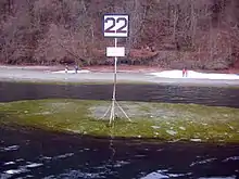 On 22 February 1945, Überlingen experienced its only bombing raid, possibly attracted by the presence of the Dachau sub-camp. In this raid, part of Operation Clarion, seven medium-range B–26 Martin Marauders of the US 320th Air Expeditionary Wing dropped 56 500 pound bombs, 7 of them with delay fuses, on the city's rail yards.[29] The bombers had taken off from the base in eastern France by Épinal and dropped their bombs at about 13:45. The bombs destroyed six residential buildings, and severely damaged 17 others; 38 buildings were slightly damaged. Eleven forced laborers, four members of the military construction crews and five residents of the Upper Station Road 97 are buried in the cemetery in the nearby pilgrim church Birnau. The memorial lies approximately 200 m (656 ft) east of the church.[30]