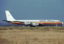 Uganda Airlines was founded as a subsidiary of the government-owned Uganda Development Corporation (UDC) in May 1976 as a replacement of the services previously operated by East African Airways.[4] It commenced operations in 1977, when Uganda Aviation Services (UAS), set up by British United Airways in 1965 but then a UDC subsidiary, was absorbed by Uganda Airlines, taking over the UAS route network.[4][5][6] Following delivery of the first Boeing 707-320C in the late 1970s, new routes to Brussels, London and Rome were inaugurated. A second Boeing 707-320C entered the fleet in 1981. That year, new routes to Cairo, Cologne and Dubai were launched, followed by Dar es Salaam, Kilimanjaro and Nairobi in subsequent years.[7]
