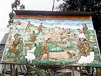 In 1886 Mwanga ordered the executions of many members of the royal court for refusing to yield to his religious demands, which he saw as insubordination. Heike Behrend says they were both Christian and Muslim converts; other sources speak only of Anglican and Catholic victims, and mention the killing of Muslims as having occurred ten years earlier at the hands of Mwanga's father Muteesa.[11] Joseph Mukasa, a convert to Christianity who had deplored the assassination of Hannington, and had tried to protect the court pages, was the first to be executed on 15 November 1885:[12] this was at the instigation of the Katikkiro (prime minister) Mukasa, whose successor Joseph Mukasa was tipped to become king.[13] Then, between 25 May and 3 June 1886, a wider series of executions were carried out.[3][14] Mwanga instructed the killing of all the young men who disobeyed him – partly to satisfy the demands of the older chiefs. Twenty-two of the men, who had converted to Catholicism, were burned alive at Namugongo in 1886.