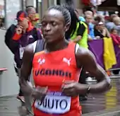 Jane Suuto was the joint oldest person to represent Uganda at the London Games at the age of 33. She had not entered any previous Summer Olympics.[3] Sutto qualified for the Games because she achieved a third-place finish at the 2012 Riga Marathon with a time of 2 hours, 42 minutes, 7 seconds, that met the "B" qualifying standard for the women's marathon.[10][42] In an interview with New Vision before she competed Suuto said: "I will not promise a medal but I will go out there to offer my best and whatever God offers me. I will take it with both hands. I will go out there and fight."[42] In the event held on 5 August, she finished 93rd out of 107 athletes, with a time of two hours, 44 minutes and 46 seconds.[43] Suuto finished 21 minutes, 39 seconds behind winner Tiki Gelana of Ethiopia (2 hours, 23 minutes, 7 seconds).[n 7][43]