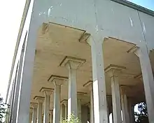 The concrete structure, design by architect Paul Hedqvist and built in 1935, is composed of 64 pillars, each of 1×1 metre cross section and 14 metres tall,[1] carrying the uninsulated tank of 78×39×6 metres, containing 18 thousand cubic metres, crowned by a small lantern. One of the most prominent landmarks in central Stockholm observable from elevated locations kilometres away, the classical structure has a monumentality further amplified by its elevated location in a forest remote from any other buildings. It is one of few remaining, visible traces of the ambitious municipal projects carried through in the early 20th century, still witnessing the restraints and possibilities of casting techniques anticipating pre-stressed concrete and slipform constructions.[2]
