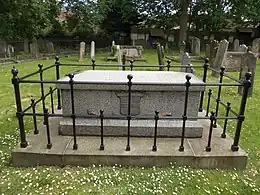 According to the History of the County of Middlesex, the scientist and businessman William Allen hired Foscolo to teach Italian at the Quaker school he co-founded, the Newington Academy for Girls.[15] His general bearing in society – as reported by Walter Scott – had not been such as to gain and retain lasting friendships. He died at Turnham Green on 10 September 1827, and was buried at St Nicholas Church, Chiswick, where his restored tomb remains to this day; it refers to him as the "wearied citizen poet", and incorrectly states his age as 50. Forty-four years after his death, on 7 June 1871, his remains were exhumed at the request of the King of Italy and taken to Florence, where with all the pride, pomp and circumstance of a great national mourning, found their final resting-place beside the monuments of Niccolò Machiavelli and Vittorio Alfieri, of Michelangelo and Galileo, in the church of Santa Croce,[8][16] the pantheon of Italian glory he had celebrated in Dei Sepolcri.