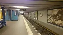 Damaged by the bombing of Berlin in World War II, the station was closed briefly in 1945; it went out of service again for four years in 1957, because of the construction of the neighbouring Kurfürstendamm station. From 1970, trains only went to Wittenbergplatz station (1.2 kilometres (0.75 mi), length) but since 1993 trains have run to Warschauer Straße station again.[2] The second entrance at the eastern end of the station, at the junction of Kurfürstendamm and Fasanenstraße, was closed in 1964, but re-opened in 2005.