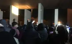 On 12 January, similar protests took place around Iran. In the morning, students gathered at the dormitories of the University of Tehran and chanted against the Supreme Leader.[18] There were around 3,000 participants in the main demonstration in Tehran according to the Iranian Labour News Agency.[13] In online social media videos posted in the evening of a location near Azadi Square in Tehran, there were sounds of gunshots, pools of blood on the ground, wounded people being carried and security personnel with rifles. Hossein Rahimi of the Tehran police stated the following day that police had "been given orders to show restraint" and didn't shoot during the protests.[19] The Iranian daily Etemad wrote "Apologise and resign" in a banner headline.[13] The Iranian president described the missile attack as an unforgivable error.[20]