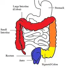 In contrast to Crohn's disease, which can affect areas of the gastrointestinal tract outside of the colon, ulcerative colitis is usually confined to the colon. Inflammation in ulcerative colitis is usually continuous, typically involving the rectum, with involvement extending proximally (to sigmoid colon, ascending colon, etc.).[20] In contrast, inflammation with Crohn's disease is often patchy, with so-called "skip lesions" (intermittent regions of inflamed bowel).[21]