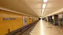 Rümmler designed a 110 meter long and almost nine meter wide central platform with two entrances. The design is similar to the contemporary metro station Möckernbrücke on the U7 line: The walls behind the tracks are tiled in yellow, the supporting pillars and the wall under the bridge, which divides the platform almost the entire length, are covered with dark basalt . The floor received bright ceramic tiles, A special feature was also the public address system: Instead of many distributed speakers, the station had a single track-long sound pipe, which had only one central speaker. The sound could escape through numerous small openings above the platform. Meanwhile, the station has a normal public address system.