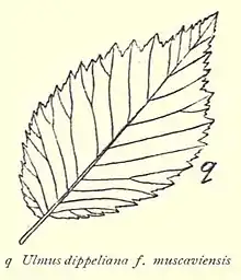 The hybrid elm cultivar Ulmus × hollandica 'Muscaviensis' was listed by Schneider in Illustriertes Handbuch der Laubholzkunde 1:219, 1904 as U. dippeliana f. muscaviensis.[1] The name 'Muscaviensis' refers to its origin in Muskau Arboretum (Arboretum Muscaviense),[2] where Eduard Petzold raised elms in the late 19th century.
