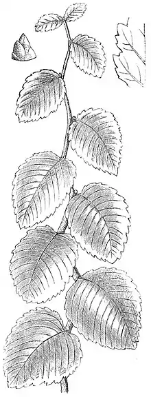 'Pitteurs' was a tall tree, chiefly distinguished by its large, rounded, convex leaves, < 20 cm long by < 19 cm broad, a little attenuate at the apex and with prominent venation. Kirchner[3] and Petzold,[4] describing a tree by that name from the Royal State Tree Nursery at Sanssouci, noted (1864) that the slightly glossy dark green leaves were obtuse-toothed, and appeared reddish-brown when they unfolded.[5] Aigret, however, reported (1905) that the specimen in the Jardin Botanique de Liège, planted in Morren's time, did not match Morren's description, having leaves of ordinary U. montana [used both for wych and for Ulmus × hollandica] dimensions, and being more elongated and acuminate than those described.[6] This suggests that Morren's measurements for 'Pitteurs', like his measurements for 'Superba', may have been based on the largest of long-shoot leaves.