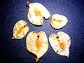 In trials conducted by Butterfly Conservation in southern Hampshire, England, 'Columella' was the only cultivar to become distressed during the drought of 2006, shedding most of its foliage by early August; a trait possibly inherited from one of the tree's ancestors, the Himalayan elm Ulmus wallichiana. 'Columella' first flowered aged 8 years, in March; the resultant seeds were found to have a moderate viability.[4] [5] 'Columella' featured in New Zealand government trials during the 1990s at the Hortresearch station, Palmerston North.
