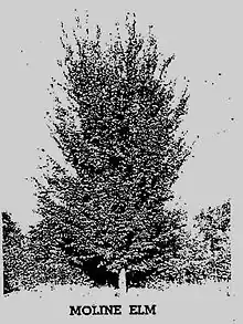 A photograph captioned 'The Moline elm as it is growing in Moline, Illinois' in the Arnold Arboretum paper 'Elms grown in America' (1951)[7] in fact shows a specimen of the field elm cultivar 'Umbraculifera' in Moline. [8]