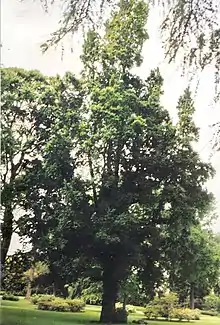 A suckering, narrow-pyramidal or columnar elm resembling a wild cypress (about 11 m), with dense upright branching and small dark-green leaves, that stood on the azalea lawn in RBGE till the 1990s (tree C2713),[33] was probably one of Späth's three 1902 'Monumentalis'. Melville renamed it U. carpinifolia × U. plotii × U. glabra in 1958.[34] The leaves were pilose above and rather distorted, the lower surface with a zone of dense hair towards the base of the midrib.[35] The tree was one of the first RBGE elms into leaf. A stand of young, narrow, slow-growing, dense-foliaged, suckering field elm, with 'Monumentalis'-like leaves, below the Nelson Monument on Calton Hill, Edinburgh (2020), may be regrowth from one of the specimens from Späth. Aerial photographs from the 1980s show a tree on this site similar in appearance and size to the RBGE specimen.[36] Calton Hill was described by Robert Louis Stevenson as "a hill of monuments", a sobriquet perhaps relevant to the planting-location of this cultivar.