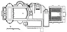The Ulpian Library continued in the tradition of Roman imperial libraries with Latin and Greek collections housed separately. In this library, they faced one another across a small colonnaded courtyard that enclosed the Column of Trajan.[10] The library was a two level structure with high vaulted ceilings to take advantage of the natural lighting. The interior walls were divided into bays by columns "set opposite pilasters that framed the niches which held the books and scrolls. There were three steps between the columns that enabled "access to a walkway in front of the bookcases."[11] At the other end of the hall were recesses for a statue on each level, presumably of Trajan and possibly of Minerva. The niches (seven total on each wall) containing recessed wooden bookcases located in both walls running the length of the library along with four others running across the back wall stored the scrolls. Estimates on the amount of scrolls held are "approximately ten thousand" for both Latin and Greek libraries. "In addition, there were archival materials, such as praetorian edicts and senatorial decrees, as well as Caesar's autobiography and Trajan's commentaries on the Dacian Wars, of which now only a few words survive."[12] The space itself was designed to be aesthetically pleasing with desks (plutei) and the books out of sight on shelves and intending for reading, but was not designed with the growth of the collection in mind.