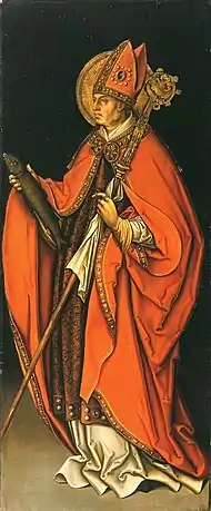 | Attributes | Bishop holding a fish; at dinner with Saint Wolfgang; rewarding a messenger with a goose leg, which turns into a fish on Friday morning; giving a garment to a beggar; with Saint Afra; riding through a river on horseback as his companion sinks; with a cross given him by an angel[2] |