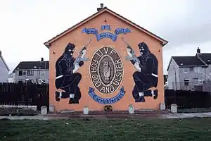 The UVF's stated goal was to combat Irish republicanism – particularly the Provisional Irish Republican Army (IRA) – and maintain Northern Ireland's status as part of the United Kingdom.[117] The vast majority of its victims were Irish Catholic civilians, who were often killed at random.[15] Whenever it claimed responsibility for its attacks, the UVF usually claimed that those targeted were IRA members or were giving help to the IRA.[118] At other times, attacks on Catholic civilians were claimed as "retaliation" for IRA actions, since the IRA drew almost all of its support from the Catholic community. Such retaliation was seen as both collective punishment and an attempt to weaken the IRA's support; it was thought that terrorising the Catholic community and inflicting such a death toll on it would force the IRA to end its campaign.[119] Many retaliatory attacks on Catholics were claimed using the covername "Protestant Action Force" (PAF), which first appeared in autumn 1974.[120] They always signed their statements with the fictitious name "Captain William Johnston".[121]
