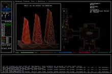 Ultima Ratio Regum is presented in a roguelike manner with ANSI characters and features permadeath. Unlike most roguelikes, Johnson has stated that combat itself will not be the main source of difficulty, and the game is instead focused around a kind of cultural detective-work[5] wherein the player pieces together clues from the world's generated culture, history, religions, social norms, etc.,[6][7] to "uncover an intellectual conspiracy to rewrite history".[1] The whole world is procedurally generated, from solar systems[8][9] (the macro scale) to small details like tombstone engravings which are displayed with generated ANSI graphics (the micro scale).[8][10] Puzzles are also generated anew each game and scattered around the world,[11] to ensure that they are "not so easily spoiled by a wiki".[8] The game does extensive procedural generation of aesthetics and graphics, ranging from tables and chairs to ornate vases and religious altars.[12]