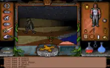 Ultima Underworld is a role-playing video game (RPG) that takes place from a first-person perspective in a three-dimensional environment.[1] The player's goal is to adventure through a large, multi-level dungeon, in which the entire game is set.[2] The player uses a freely movable mouse cursor to interact with the game's world, and with the icon-based interface on the heads-up display (HUD). Each icon has a specific effect; for example, the player uses the Look icon to examine objects closely, while the Fight icon causes the player character to ready their weapon.[1][3] The player's progression through the game is non-linear: areas may be explored, and puzzles and quests finished, in any order.[2] An automatically filling map, to which the player may add notes, records what the player has seen above a minimum level of brightness.[4] The player character may carry light sources to extend the line of sight in varying amounts.[2] Exploratory actions include looking up and down, jumping, and swimming.[5][6]