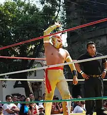 Último Dragoncito remained one of CMLL's main "tecnico" (Face or "good guy") Minis as the Mini division got more air time and promotional focus than in previous years.[5] On October 27, 2008 Último Dragoncito won the mask of Fire by winning a Luchas de Apuestas, mask vs. mask match.[12] In 2008 CMLL decided that the previously inactive Mexican National Lightweight Championship would be brought back and used as a secondary title in the Mini-Estrellas division. Último Dragoncito entered a torneo cibernetico elimination match Lightweight Championship tournament on September 9, 2008, during the match he eliminated Cosmico but was in turn pinned by Pequeño Olímpico to be eliminated from the match.[13] Último Dragoncito was one of 13 Minis that risked their mask in a Steel Cage match, in the main event of CMLL's La Hora Cero ("Zero Hour") Pay-Per-View on January 11, 2009. Último Dragoncito was the 10th wrestler to escape the cage to save his mask.[14] A few weeks later, on the annual Homejae a Dos Leyendas ("Homage to Two Legends") show Dragoncito, Pequeño Olímpico and Shockercito defeated Pequeño Violencia, Pequeño Black Warrior and Pierrothito.[15] On January 6, 2009 he competed in his first ever Pequeños Reyes del Aire ("Little Kings of the Air") where he was the eight participant eliminated after a leap out of the ring went wrong and he crashed into the audience and was unable to continue in the match.[16] He also competed in the 2010 Pequeños Reyes del Aire tournament, eliminating Pequeño Black Warrior and Pequeño Damián 666 before being eliminated by eventual tournament winner Pequeño Nitro.[17] Dragoncito, Shockercito and Mascarita Dorada lost to Pequeño Olímpico, Pequeño Black Warrior and Pierrothito on the under-card of the CMLL Entre el Cielo y el Infierno ("Between Heaven and Hell") show on October 15, 2010.[18] The following year Electrico and Último Dragóncito lost to Demus 3:16 and Pierrothito on CMLL's year end Sin Piedad show.[19] In 2012 Último Dragóncito won the 2012 Pequeños Reyes del Aire tournament held in Mexico City, eliminating Pequeño Olímpico and Pierrothito to win the tournament.[20] A few months later CMLL held a Guadalajara version of the 2012 Pequeños Reyes del Aire tournament, but this time he was the last man eliminated by tournament winner Pequeño Black Warrior.[21] On November 6, 2012, 12 competitors met in a special steel cage match where the loser of the match would be forced to unmask or have his hair shaved completely off. The match was very chaotic and saw several wrestlers bleed and others need medical attention due to a number of accidents. Último Dragoncito was the eight person overall to escape the cage, one of the few people to escape the match unscathed.[22][23][24] Astral, Electrico and Ultimo Dragoncito defeated Pierrothito, Pequeño Violencia and Pequeño Nitro as part of the 2011 Homenaje a Dos Leyendas show.[25] In mid-2013 the Mexican National Lightweight Championship was vacated and CMLL held a tournament to find a new champion. Dragoncito entered a torneo cibernetico elimination match on August 6 for a spot in the finals of the tournament. He was the last man eliminated by finalist Pequeño Nitro.[26] In the winter of 2013/early 2014 Último Dragóncito began a storyline feud with then CMLL World Mini-Estrellas Champion Pequeño Olímpico over the championship. As part of the build to an eventual title match between the two Pequeño Olímpico and Último Dragóncito eliminated each other from the 2014 Pequeños Reyes del Aire tournament via a double pin.[27][28] Dragoncito would later receive a title match but was unable to become a three time champion. On April 6, 2014 Dragoncito was one of 10 wrestlers putting their mask on the line in a Steel Cage match that was the main event of the 71. Aniversario de Arena Coliseo show. Dragoncito escaped with his mask while Pequeño Halcón was pinned by Astral and had to unmask afterwards.[29][30] On October 5, 2015 14 Mini-Estrellas, including Dragoncito, competed in a battle royal to determine the #1 contender for the CMLL World Mini-Estrellas Championship, the match was won by Electrico.[31] Dragoncito participated in the 2015 Pequeños Reyes del Aire tournament, his sixth overall tournament, but was eliminated as the fourth over-all competitor.[32] For the 30th anniversary of the Pequeños Estrellas, a Torneo Cibérnetico (Cybernetic Tournament) was made, in which Full Metal, Pequeño Pólvora, Pierrothito, Pequeño Olímpico, Pequeño Violencia, Minos, Mercurio, Aéreo, Angelito, Fantasy, Último Dragoncito, Shockercito, Acero, Pequeño Magia and Kaligua participated. Dragoncito and Olímpico were the losers to Shockercito and Mercurio, respectively. Dragoncito and Olímpico fought in one round and Olímpico defeated Dragoncito.
