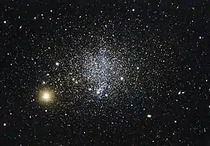 Ultra-compact dwarf galaxies (UCD) are a class of very compact galaxies with very high stellar densities, discovered[22][23][24] in the 2000s. They are thought to be on the order of 200 light years across, containing about 100 million stars.[25] It is theorised that these are the cores of nucleated dwarf elliptical galaxies that have been stripped of gas and outlying stars by tidal interactions, travelling through the hearts of rich clusters.[26] UCDs have been found in the Virgo Cluster, Fornax Cluster, Abell 1689, and the Coma Cluster, amongst others.[27] In particular, an unprecedentedly large sample of ~ 100 UCDs has been found in the core region of the Virgo cluster by the Next Generation Virgo Cluster Survey team.[28] The first ever relatively robust studies of the global properties of Virgo UCDs suggest that UCDs have distinct dynamical[29] and structural[30] properties from normal globular clusters. An extreme example of UCD is M60-UCD1, about 54 million light years away, which contains approximately 200 million solar masses within a 160 light year radius; its central region packs in stars about 25 times closer together than stars in Earth's region in the Milky Way.[31][32] M59-UCD3 is approximately the same size as M60-UCD1 with a half-light radius, rh, of approximately 20 parsecs but is 40% more luminous with an absolute visual magnitude of approximately −14.6. This makes M59-UCD3 the densest known galaxy.[33] Based on stellar orbital velocities, two UCD in the Virgo Cluster are claimed to have supermassive black holes weighing 13% and 18% of the galaxies' masses.[34]